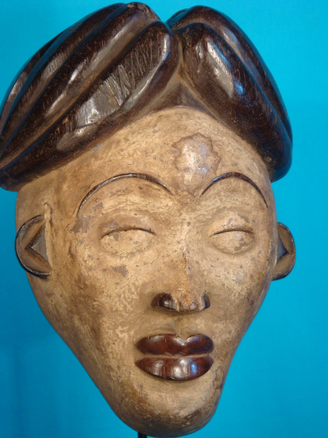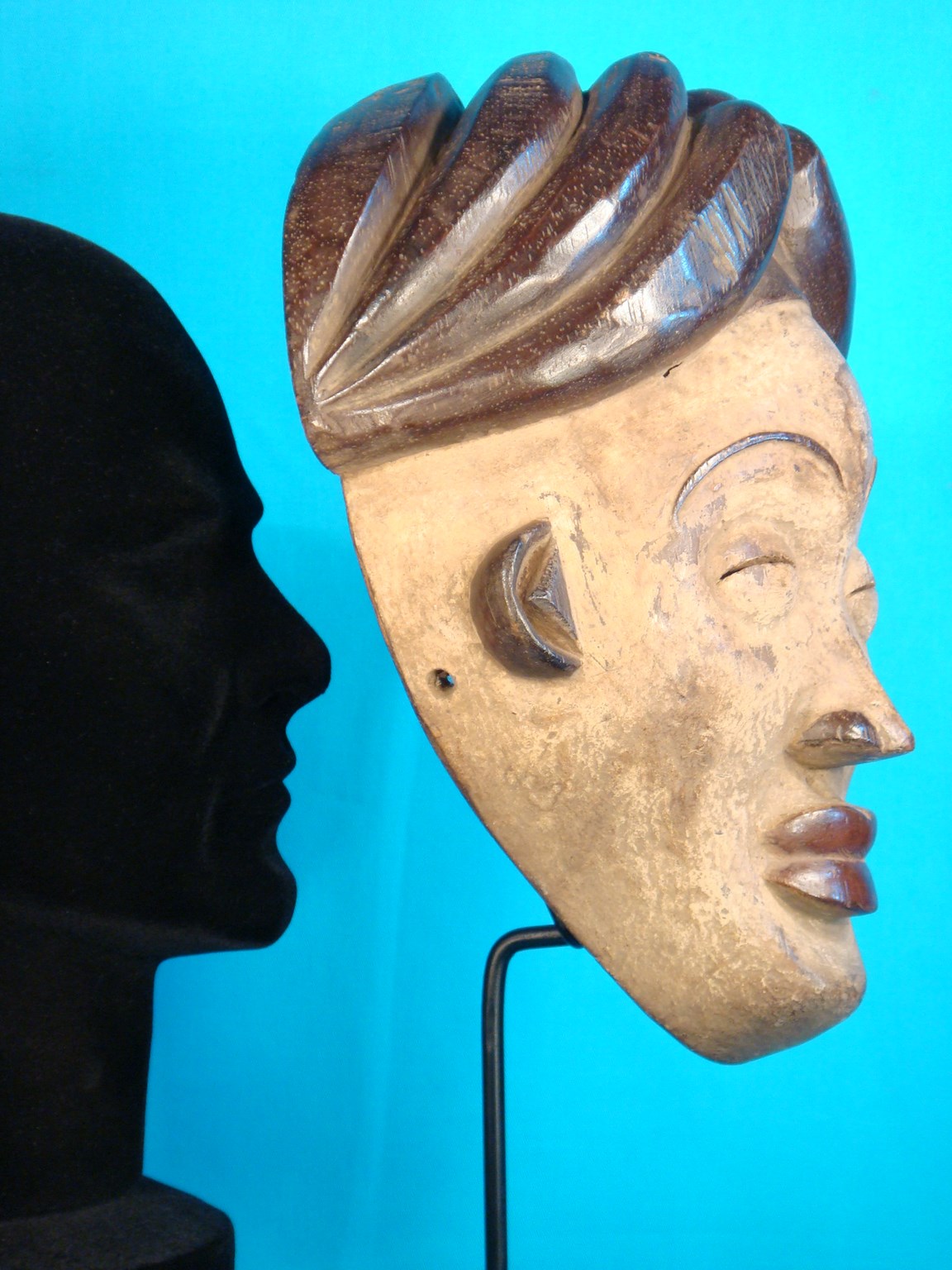 Masque Punu du Gabon Titre de l'objet : Masque Punu du Gabon Description : Ancien masque de collection - Masque Punu du Gabon - hauteur : 37 cm - bois de buvinga - poids : 700 gr - masque ancien de collection qui servait à l'époque, à couvrir le visage de la personne défunte - La coiffe est composée d'une chignon à une coque et de 2 tresses latérales - avec des scarifications en haut relief - légères imperfections dues à l'âge - livraison rapide colissimo en 48 h Matière : 900 - Réf annonce n° 350 Voir toutes les photos jusqu'en bas de la page